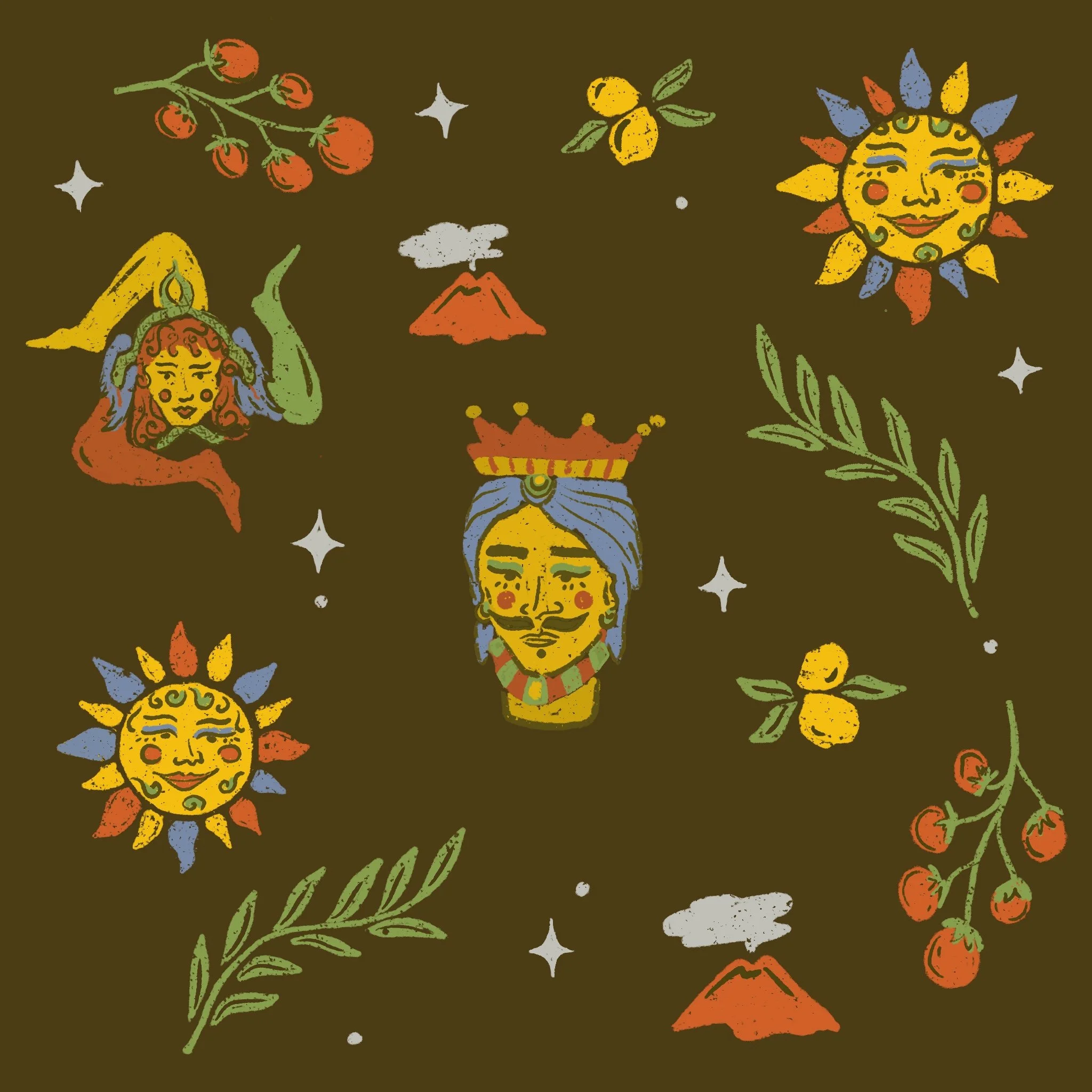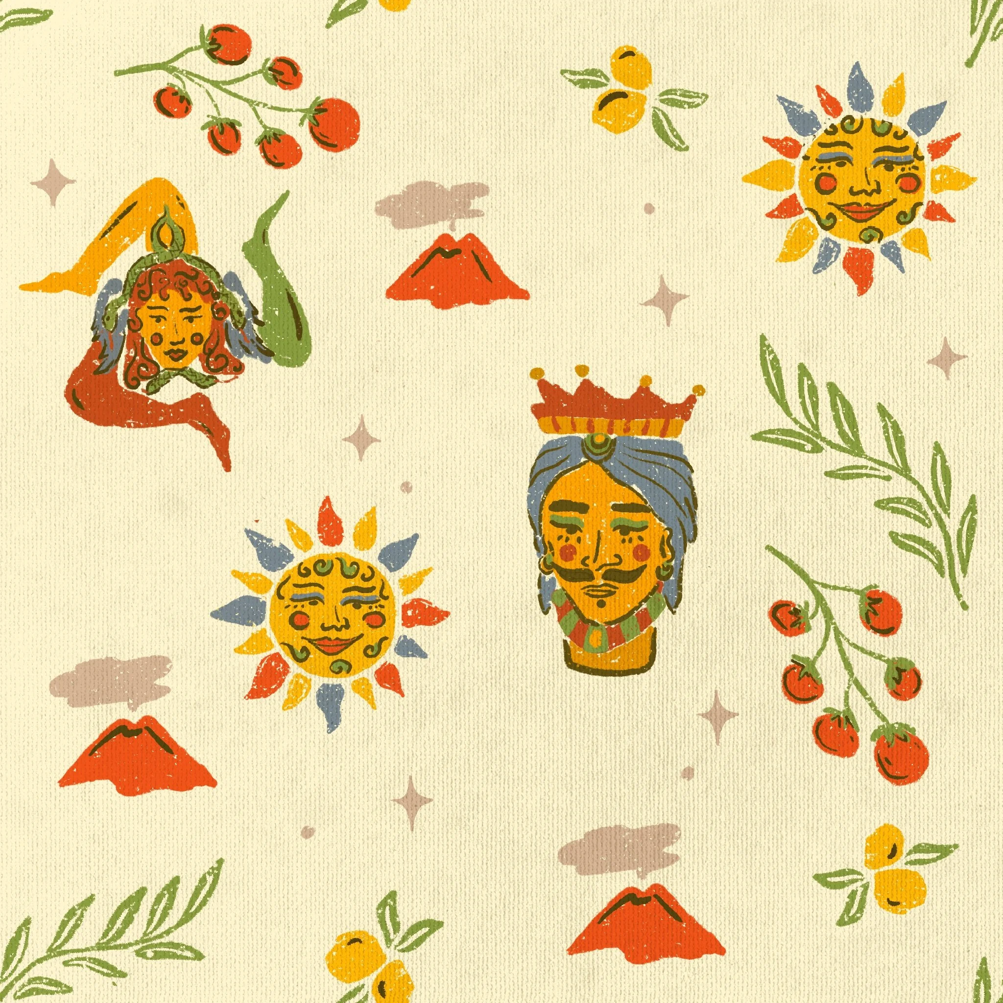 I made this sicilian pattern inspired by my time living there, representing the most iconic things from Sicily: the Trinacria, the king, the Etna Vulcano and their organic lemons, olives and tomatoes.